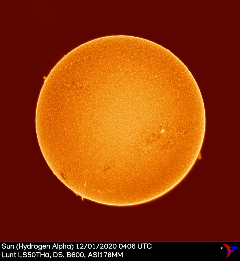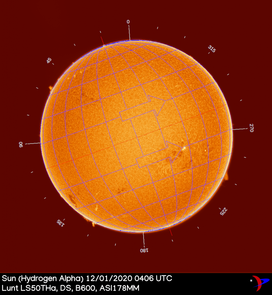 Les comparto algunas imágenes del sol que pude capturar el 1 de diciembre de 2020. Hay una mancha solar enorme, denominada AR 2790, la cual está poco a poco orientándose en nuestra dirección. Se puede apreciar en las imágenes en la parte inferior izquierda, cerca de la marca de los 135 grados (ver imagen anotada).
