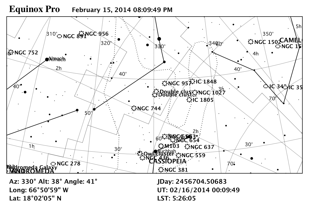 El Cúmulo Doble en Perseo es uno de los objetos de espacio profundo más fáciles de observar para los aficionados; tanto así, que bajo cielos oscuros es posible observarlo a simple vista. Ya que la luna todavía está prácticamente en su fase llena, si se toman fotos con filtros LRGB (no banda corta) los objetos a fotografiar deben ser bastante brillantes para sobresalir sobre el resplandor de la luna.
