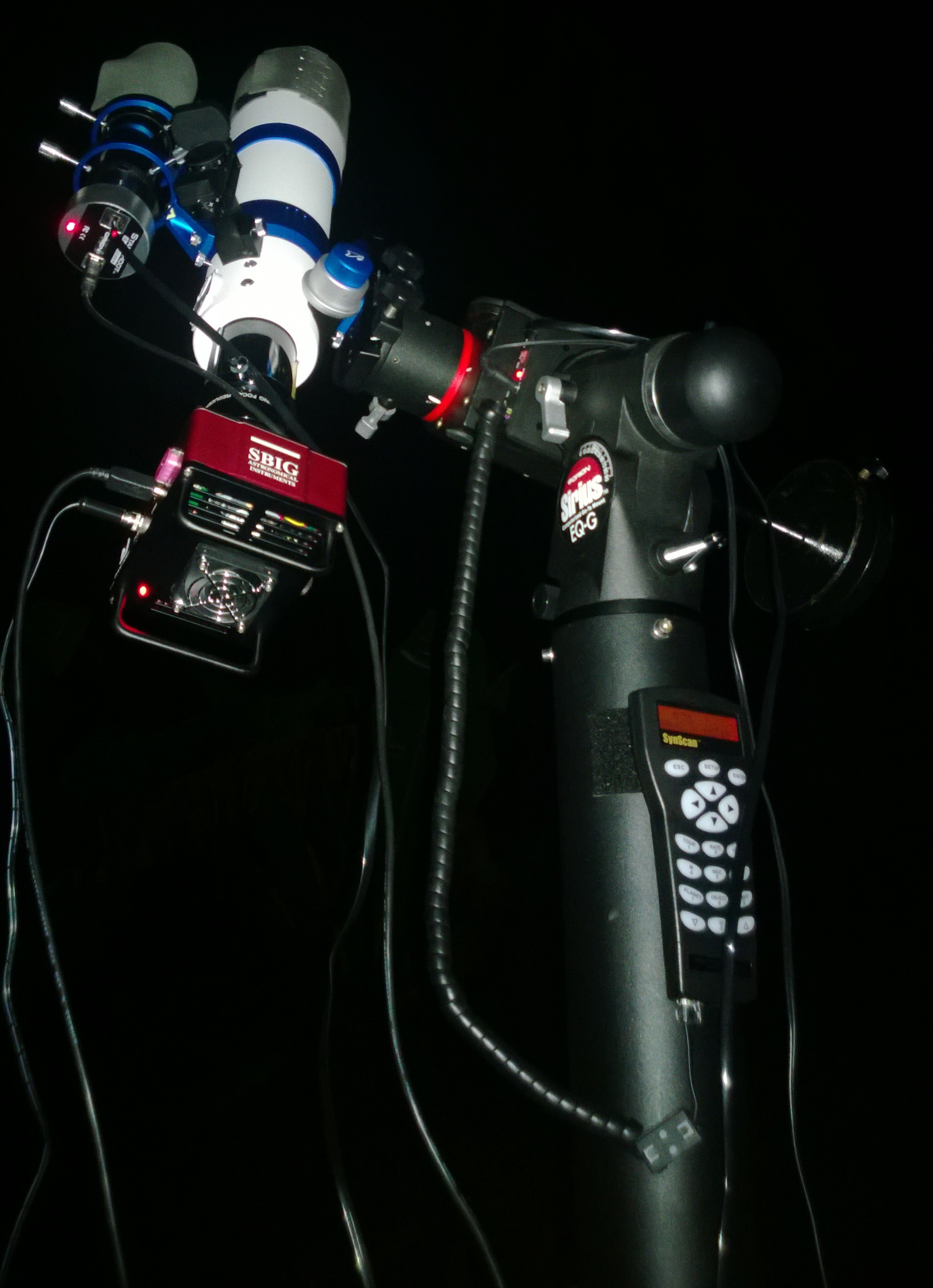 Estuve hoy tratando hoy de tomar fotos antes de que la luna llegara a perturbar de nuevo la ocuridad del cielo nocturno, pero la bruma no me permitió lograr mucho… más abajo pueden apreciar una composición de 9 imágenes de 7 minutos de la galaxia Andrómeda, la cual sale con gradientes alrededor de las zonas brillantes debido a la bruma. No obstante, el hecho de que literalmente estuviera tomando fotos a través de las nubes dice mucho de la STF-8300. Me siento muy cómodo con esta cámara.