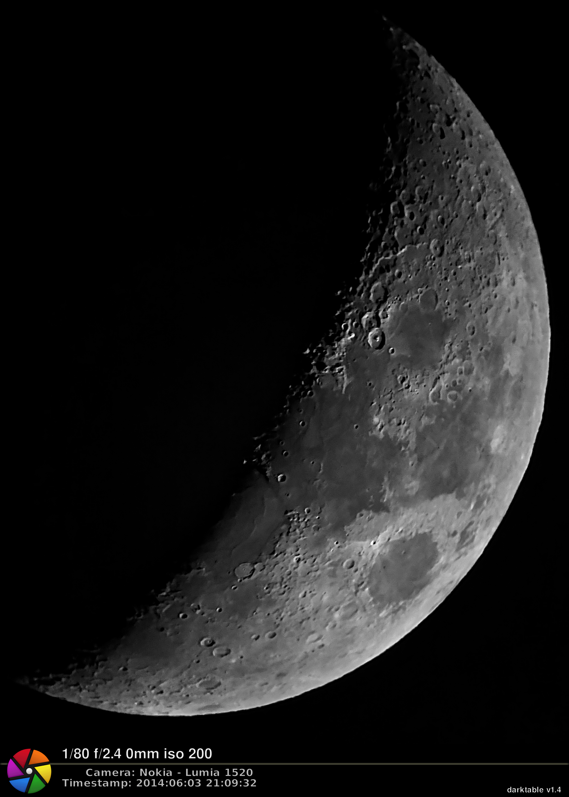 Al fin vi la luna en el cielo después de tantos días con lluvia y mal tiempo! Aunque el clima estaba pésimo, decidí sacar mi telescopio refractor de 4″ para retratar la luna creciente con mi teléfono Nokia Lumia 1520, el cual tiene una cámara de 20 megapixeles. El propósito de esto fue averiguar cuán decentes pueden ser las fotos astronómicas tomadas con celular, y el teléfono no me defraudó! Aquí les comparto mi imagen de la luna creciente de hoy tomada con mi telescopio Celestron 102GT y mi Nokia Lumia 1520, procesada en darktable. La foto fue tomada en modo afocal utilizando un ocular Vixen NPL de 15mm (67x).