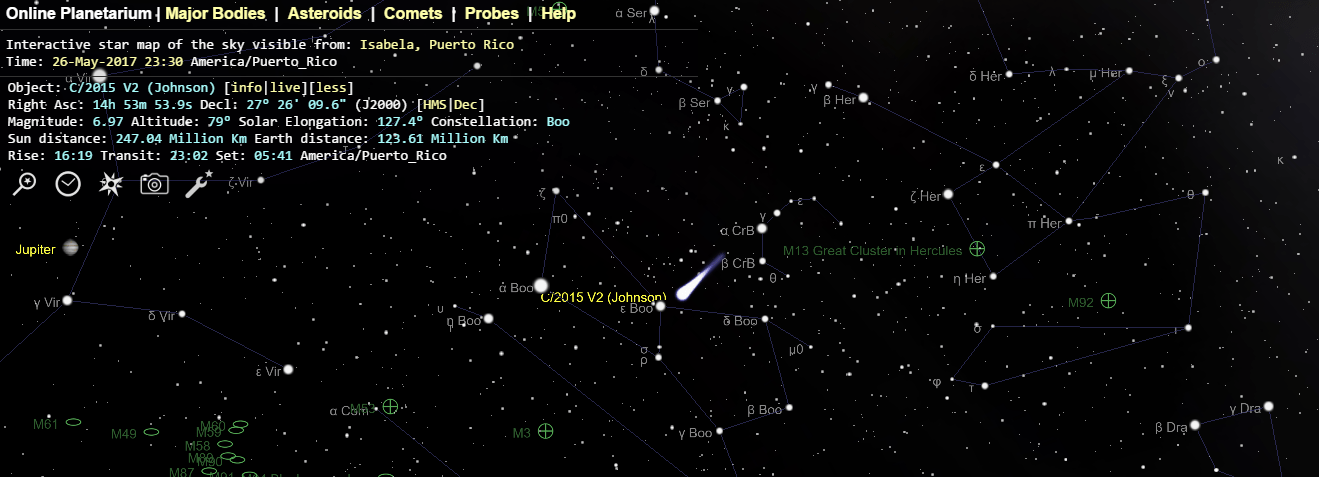 Hace dos noches pude capturar mi primera astrofotografía de un cometa del 2017, el Johnson C/2015 V2. Este cometa, descubierto en noviembre 2015, brillaba con una magnitud 6.97 en la constelación de Bootes el 27 de mayo de 2015 a las 3:30 (UTC -4). Después de ubicar el telescopio en la dirección general del cometa, éste se vio claramente a través del campo visual de la cámara de autoguiado (SSAG/50mm f3.2). Este se encontraba bastante cerca de la estrella Izar, por lo que no fue muy difícil encontrarlo .