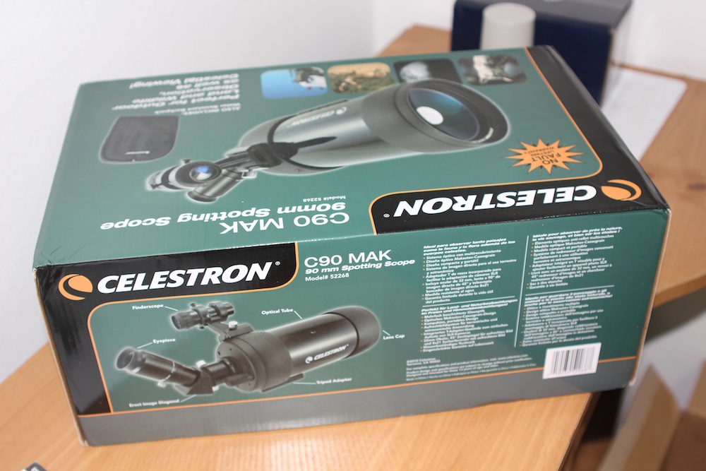 Conociendo un poco más sobre los MCT, en especial sobre el C90, averigüé que es una de las mejores gangas en la astronomía que existen en la actualidad. Este modelo de telescopio, cuando se introdujo en los años 70, costaba unos $500, lo cual equivale a más de $1000 en la actualidad. No obstante su apertura, su largo focal provee una magnificación estupenda para observar la luna y los planetas. Los objetos de espacio profundo, sin embargo, no son su fuerte, pero de todas maneras es mejor un telescopio que haga una cosa bien que dos mal hechas. Lo mejor de todo es su portabilidad y especialmente su precio, el cual es de unos $200, y cuando vi uno nuevo por $150 en eBay, sencillamente no pude resistirme. Más de dos semanas esperé a que llegara el paquete, rogando que llegara en buen estado, ya que en muchas ocasiones el manejo de estos paquetes no es el mejor.