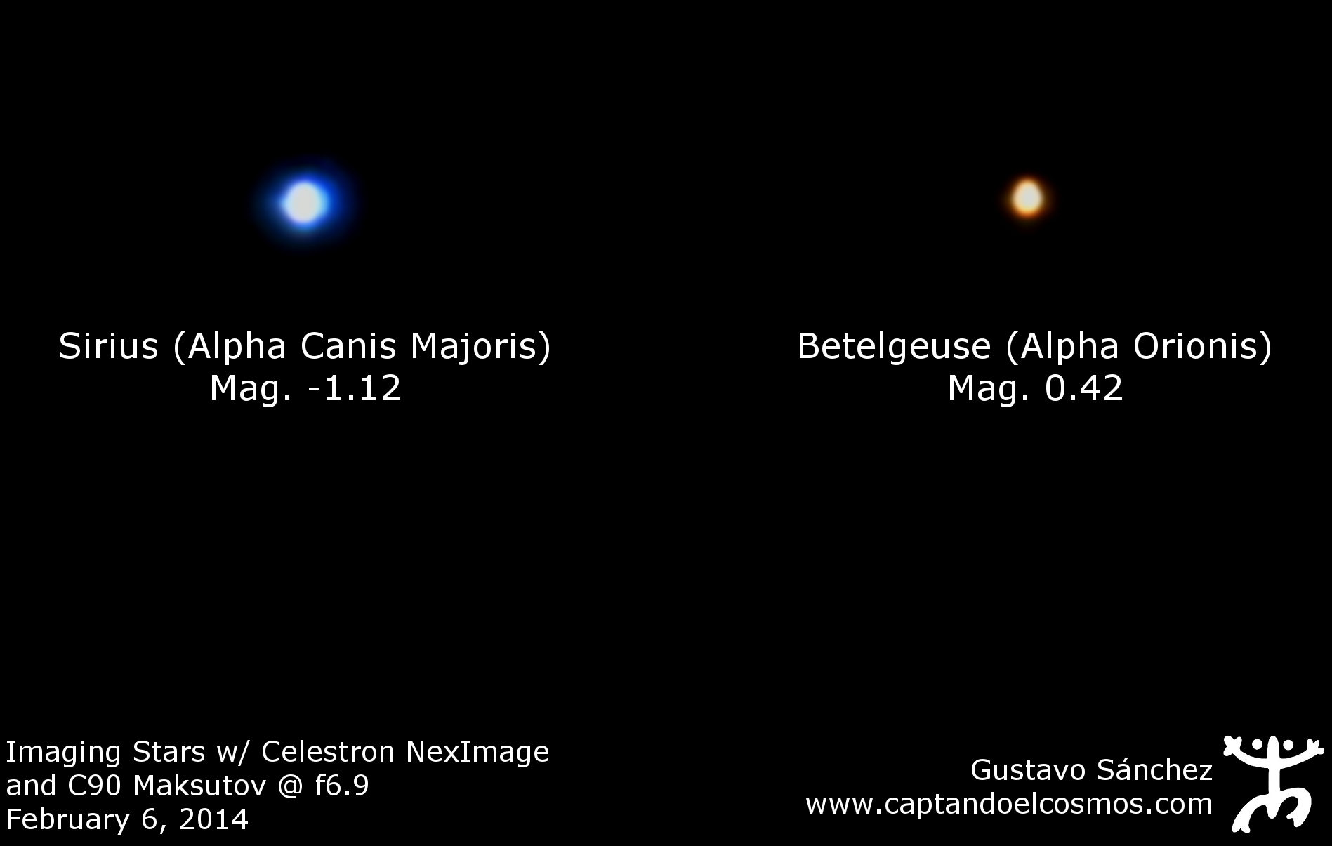 Escogí para empezar la estrella más brillante firmamento, la estrella Sirius (Alpha Canis Major), con una magnitud de -1.12. La estrella se vio perfectamente expuesta en la imagen aún con la sensitividad de la cámara en su mínimo, lo cual permitió que la imagen se viera muy limpia, sólo afectada por el seeing y no por la electrónica de la NexImage. Como esta primera prueba fue satisfactoria, mi segundo intento fue con una estrella un poco menos brillante: Betelgeuse. Esta gigante roja, también conocida como Alpha Orionis, tiene una magnitud de 0.42, todavía muy brillante. Esta estrella la capturé de manera similar a Sirius. Mi tercer intento, el cual no grabé en vídeo, fue con la estrella Maia en las Pléyades, la cual se veía ya tenue pero completamente visible en la pantalla con su magnitud de 3.87. Creo que puedo establecer un límite práctico de magnitud en 3.9 para mis futuras grabaciones de estrellas en vídeo con la NexImage y el C90.