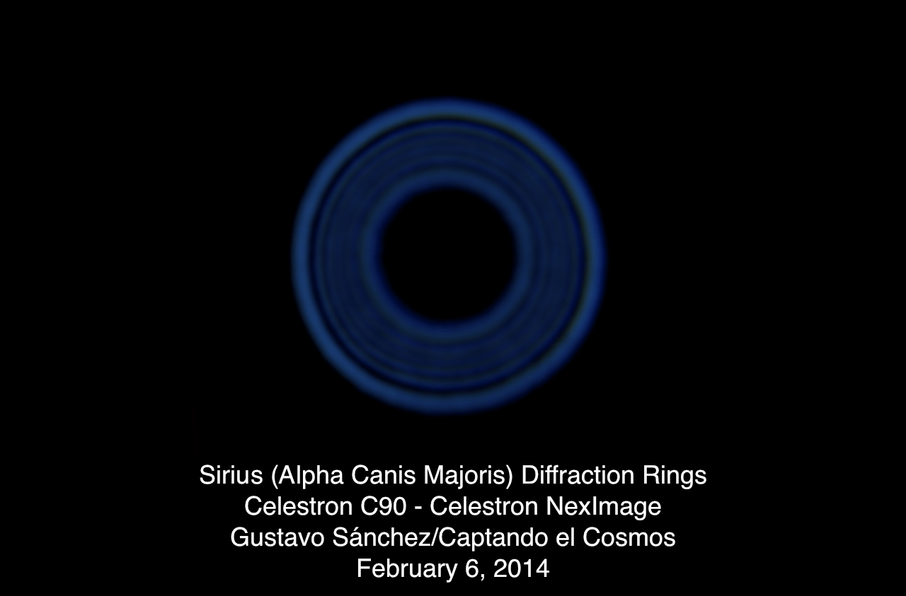Antes de terminar esta ocasión, quise verificar la colimación de mi telescopio. Este modelo en particular viene colimado de fábrica, pero no permite ajustes por el usuario, por lo que si se desajusta hay que enviarlo de vuelta a Celestron para reparación. Para esto, hice un «Star Test» sencillo, quitando el reductor del sistema y desenfocando la estrella Sirius para ver la distribución de sus anillos de difracción. Básandome en esta imagen, puedo comprobar que la colimación del telescopio está afortunadamente muy bien.