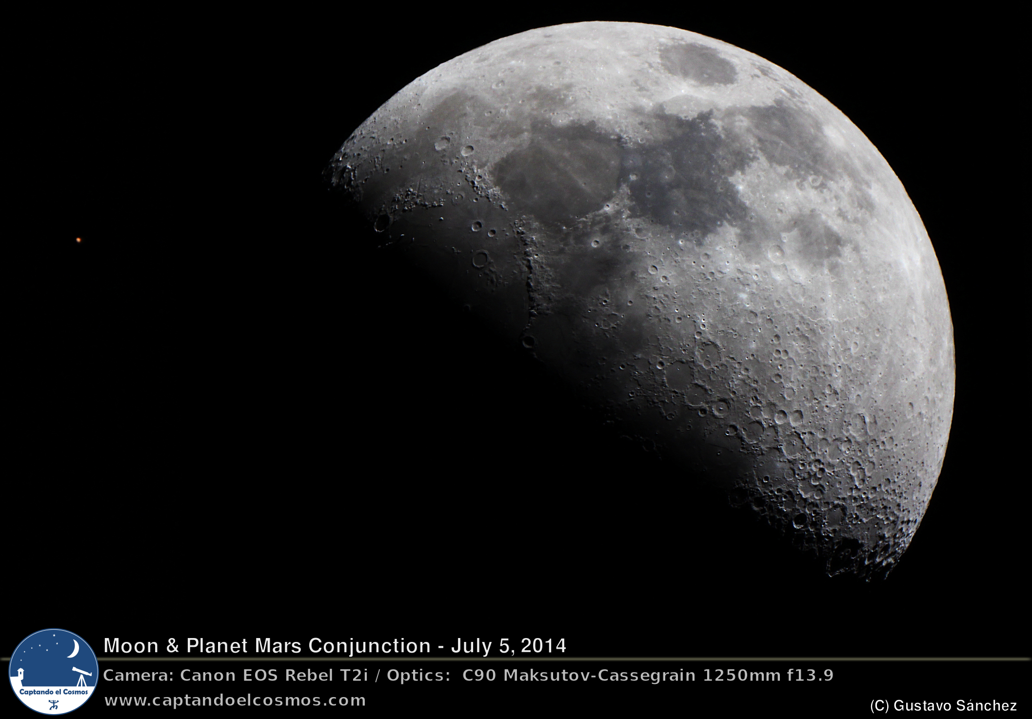 Saludos, les comparto este fenómeno captado desde Isabela, Puerto Rico. Aunque no fue visto desde mi pueblo como un ocultamiento del planeta por parte de la luna, de todas maneras estos astros se vieron extremadamente cerca en el cielo esta noche. Esta imagen fue tomada con mi cámara Canon EOS Rebel T2i y mi telescopio Celestron C90 Maksutov-Cassegrain. Procesado en GIMP y darktable.