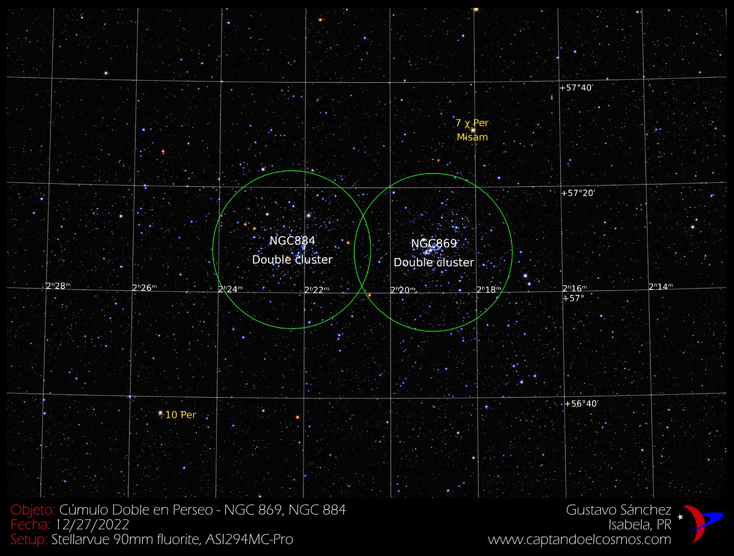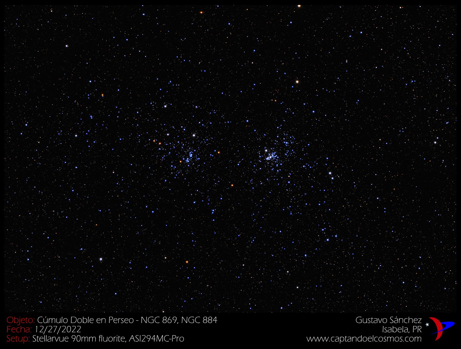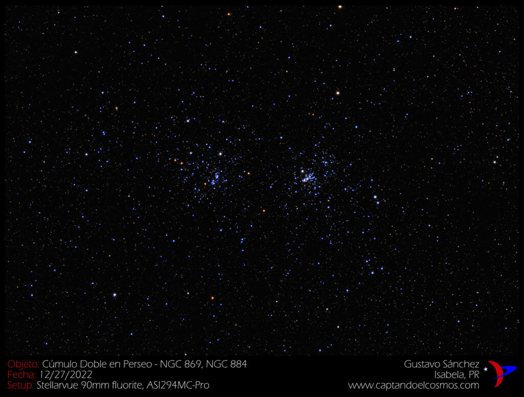 Hola! Esta imagen me trae muy gratos recuerdos, ya que el «Double Cluster» o Cúmulo Doble en la constelación de Perseo es uno de los primeros objetos que pude observar con mi telescopio hace más de una década. El observar con mis propios ojos (a través del telescopio claro) a impresionante agrupación doble de puntos de luz es una memoria que no olvido. Llamados individualmente NGC 869 y NGC 884 (ver abajo), estos cúmulos se pueden apreciar a simple vista bajos cielos oscuros, y se encuentran a unos 7,500 años-luz de distancia. Catalogados por primera vez por el astrónomo griego Hiparco, no fue hasta que se inventó el telescopio que se descubrió su composición de miles de estrellas.