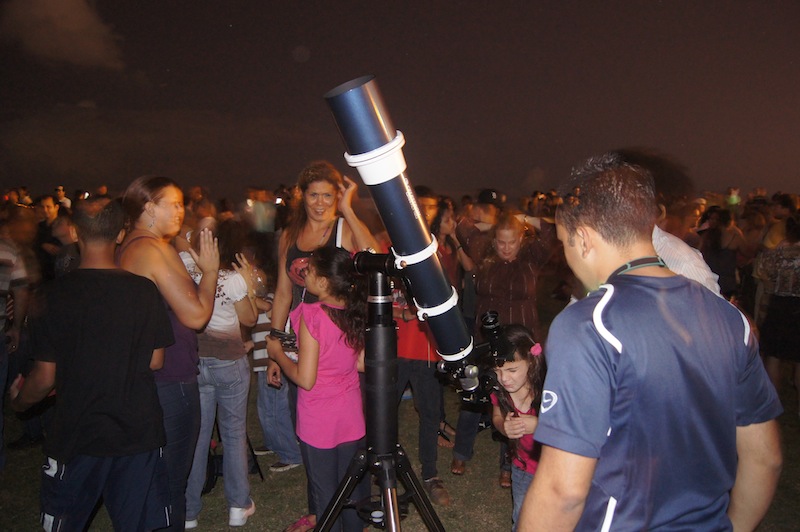 Para esta ocasión, decidí darle prioridad a la simplicidad sobre la sofisticación a la hora de escoger el equipo que llevé, ya que utilicé una montura manual altitud-azimuto para fácil manejo. La ventaja de las monturas manuales es que no hay que preocuparse por el proceso de alineamiento estelar inicial ni llevar equipo adicional como baterías, etc. El telescopio utilizado fue un refractor acromático de 120mm de apertura y 1000mm de largo focal, el cual es muy apropiado para actividades como ésta. Además de este telescopio, había unos 10 telescopios adicionales de todas las formas y tamaños para que esos 2000 asistentes pudieran observar lo que se apreciaba en el cielo anoche.
