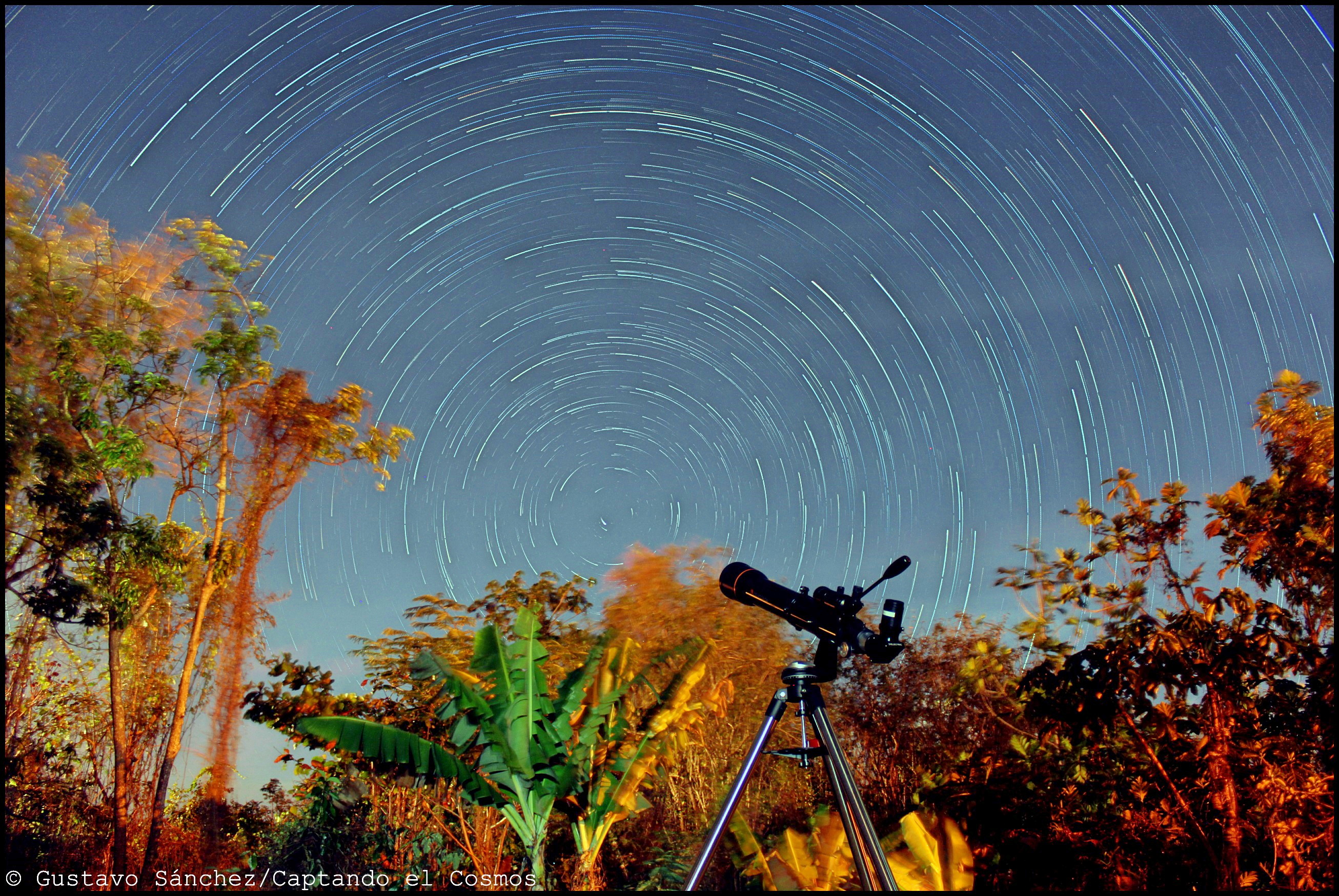 Saludos! Les comparto mi primera práctica capturando estelas de estrellas. Esta composición fue creada capturando 181 imágenes de 1 minuto cada una (Canon EOS Rebel T2i, kit lens) y combinándolas en StarStax. La imagen fue tomada mirando directamente al norte para apreciar la rotación de la Tierra con respecto a Polaris. Espero les guste!