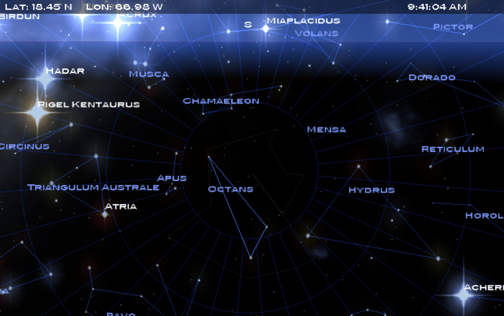 La constelación del Octante fue categorizada como constelación en el siglo 18, por lo que no tiene un origen mitológico como muchas otras. Se llama así en nombre del octante, un instrumento utilizado para navegación. Esta constelación es lo que yo llamaría «La Osa Menor» del Polo Sur. Esto es debido a que dentro de la constelación del Octante es que se encuentra el Polo Sur del firmamento (el polo se encuentra aproximadamente a 1 grado de distancia de la estrella Sigma Octantis), de manera similar a Polaris en el Polo Norte.