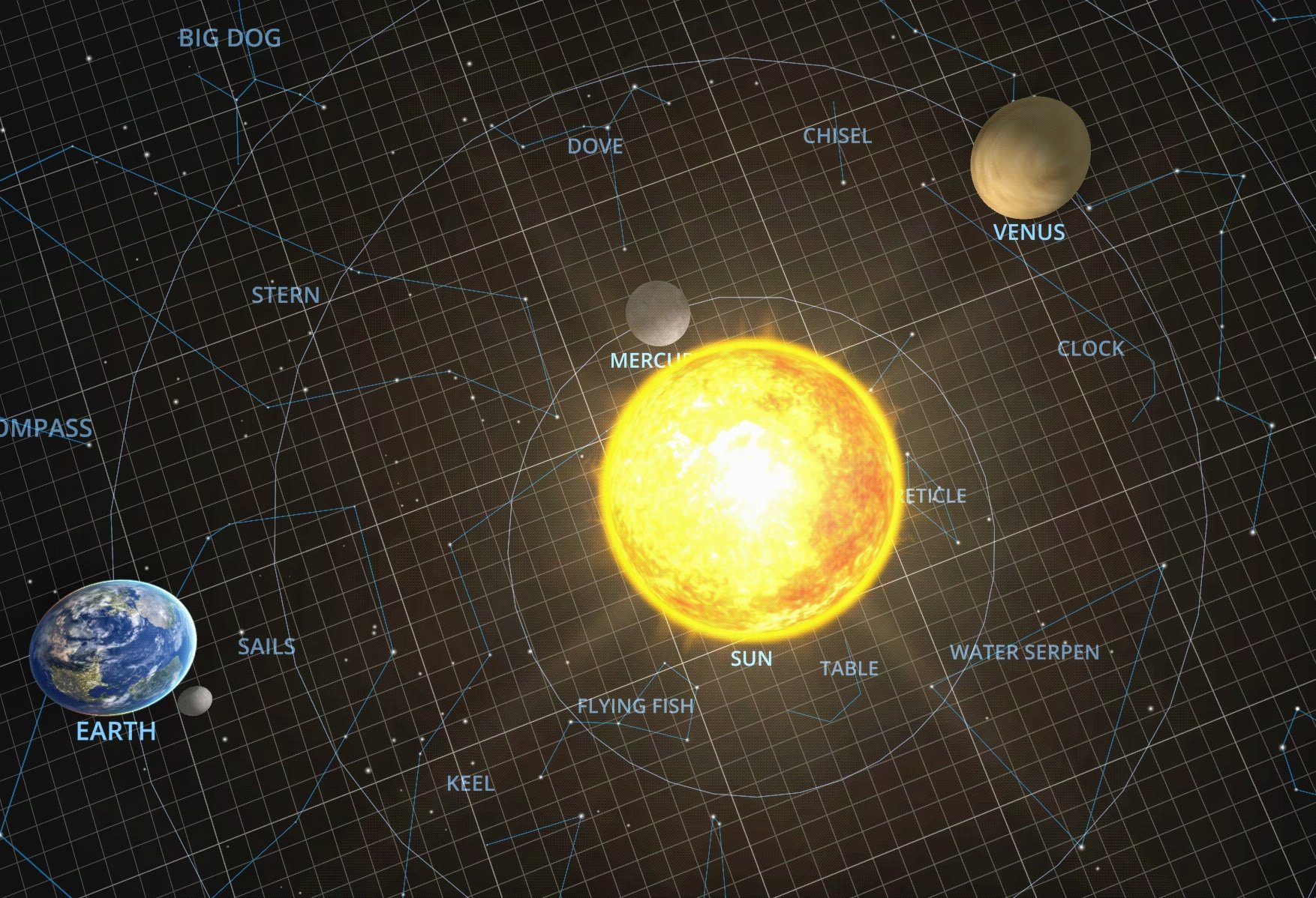 A la mañana siguiente, mientras me preparo para ir a trabajar, me recuerdo de la observación de Venus la noche anterior? Por qué no se veía tan brillante como en otras ocasiones, que casi parecía las luces de un avión? Lo que al principio pensé que tal vez su fase o % de superficie iluminada no era tanta, bajándole su luminosidad, pero la observación me demostró que no era así. Por otro lado, Mercurio se veía relativamente grande en comparación con Venus, no más grande, pero solo un poco más pequeño, lo cual tampoco tiene sentido si Venís es más grande y está más cerca. A menos… Que no sea así. La única explicación que se me ocurrió fue que entonces Venus tenía que estar más lejos que Mercurio, entonces al otro lado de su órbita alrededor del Sol. Usando el Solar System Scope, pude obtener este diagrama de las órbitas de los planetas interiores que observé: