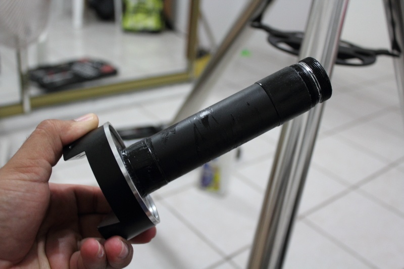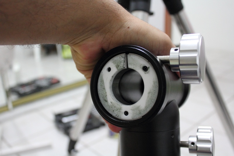 Como se puede ver en las fotos, en bien fácil desarmar el eje de altitud. Con mucho cuidado, limpié y removí la grasa existente en el eje, y la reemplacé con la nueva grasa de litio blanco. Luego reemplacé cada pieza tal como estaba en orden inverso.