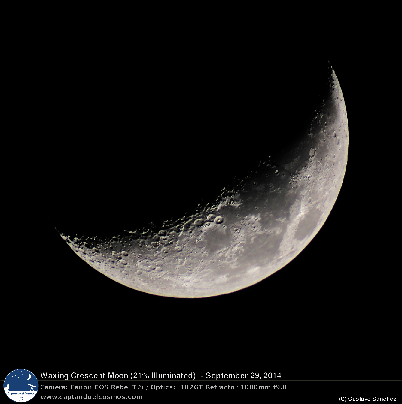 Les comparto mi segunda foto de la luna en este ciclo lunar que comenzó el pasado 24 de septiembre de 2014. Fue tomada con el equipo de siempre: Celestron 102GT f/9.8, Canon EOS Rebel T2i. Procesado en darktable y RawTherapee.
