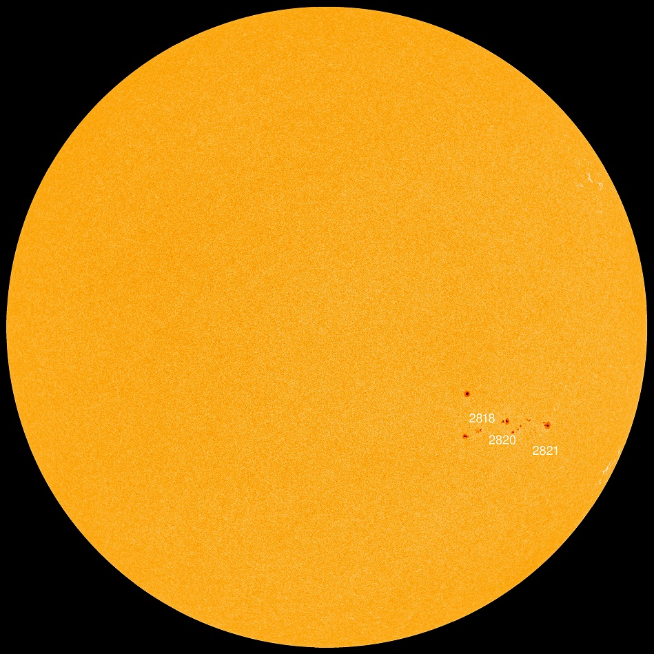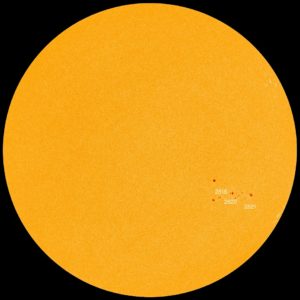 El día de hoy se pueden apreciar, ya cerca del borde de la cara próxima a nosotros, varias manchas solares o regiones activas. Según la página www.spaceweather.com, las regiones activas se muestran con la siguiente notarización: