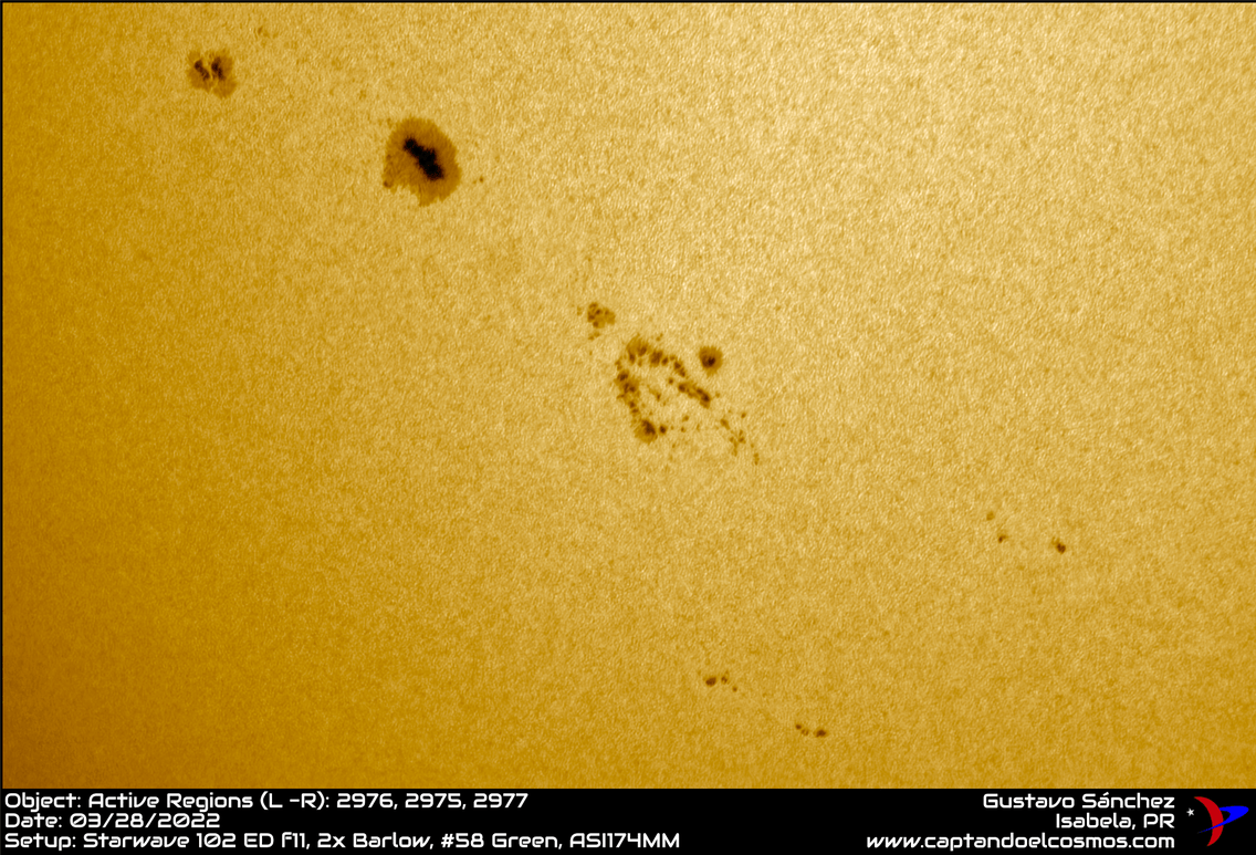 Con un equipo de nivel aficionado con el que tengo, es posible ver con mucha claridad varias de las manchas solares («Regiones Activas») presentes en el sol actualmente: