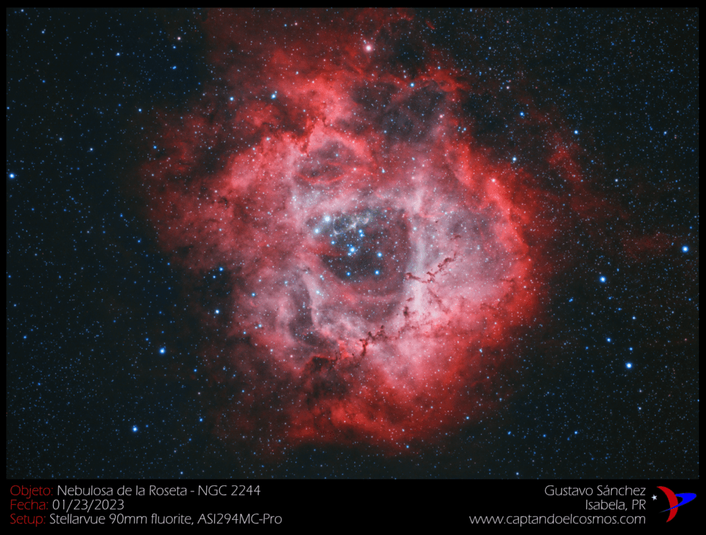 Les comparto mi primera imagen del año 2023, la cual muestra uno de los objetos del cielo invernal más conocidos: la nebulosa de la Roseta o NGC 2244 en la constelación de Monoceros (en realidad, la nebulosa es catalogada como Caldwell 49, y el cúmulo en su centro NGC 2244). Esta imagen, la cual muestra una gran zona de gas ionizado de hidrógeno alrededor de un cúmulo abierto de estrellas gigantes, me tomó unas 6 horas de exposición para lograr capturar la cantidad de fotones necesaria. Utilicé un filtro de banda reducida Optolong L-eNhance para acentuar la nebulosa y minimizar la luz estelar.