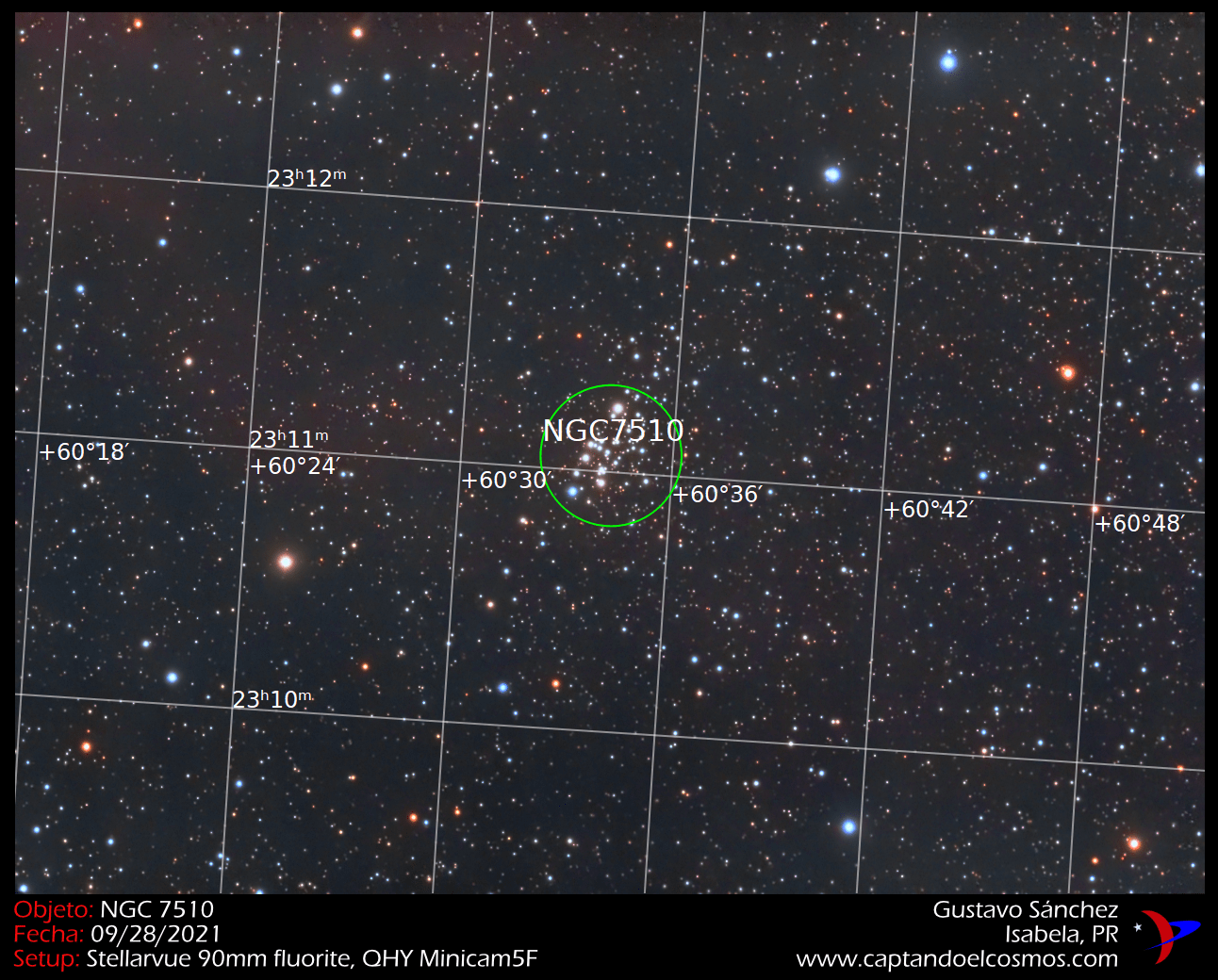 Continuando con el procesado de esta nueva imagen, y motivado por estos resultados preliminares tan prometedores, pude extraer mucho más data de la imagen, sin que el ruido que anteriormente se me hacía casi imposible remover, me impidiera el poder resaltar detalles mucho más sutiles y tenues. Así las cosas, les muestro el nuevo reprocesado para el cúmulo NGC 7510, utilizando exactamente la misma data que hizo posible la imagen de 2021: