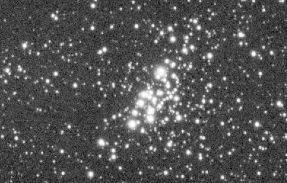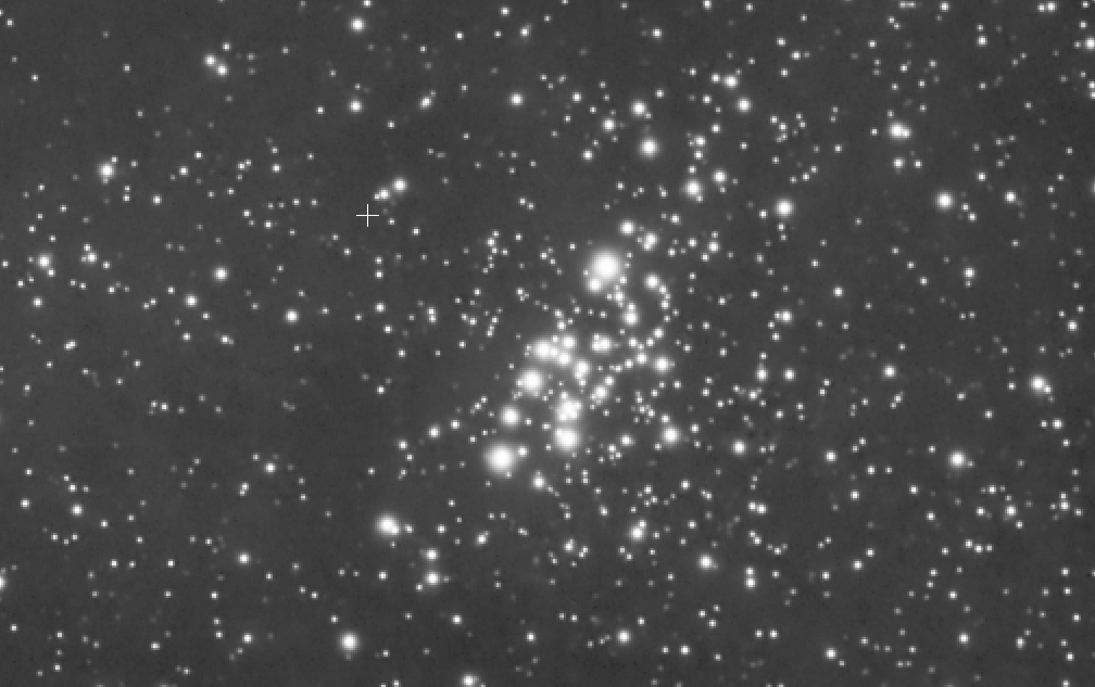 Bueno, para ser una cámara planetaria enfriada, creo que no quedó mal, no? Aunque tuve que luchar bastante con el ruido residual en la imagen, creo que pude captar el cúmulo bastante bien y preservar los colores de las estrellas lo mejor que pude. Bueno ahora… vayamos hacia adelante dos años, y ahora armados con estos plugins veamos cómo podemos hacer para mejorar la foto. Este es la luminancia original de la foto, justo después del apilado: