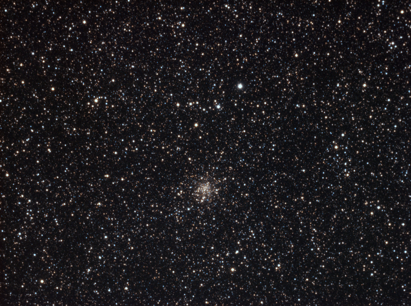 Después de dos semanas sin sacar el telescopio, la noche de 25 de julio me permitió capturar dos imágenes de cúmulos estelares, aprovechando el que la luna salió un poco tarde. Las condiciones del tiempo no fueron las mejores, ya que la bruma y las nubes deterioraron un poco el clima. No me quise arriesgar mucho con el equipo, ya que la última vez tuve problemas con el guiado, por lo que mis exposiciones fueron de 5 minutos, en comparación con lo usual que son 10 minutos. En este intento, el guiado fue lo suficientemente bueno como para que no hubieran estelas en las exposiciones, pero en mi primera imagen tuve problemas con unos «dark pixels» que usualmente aparecen cuando la cámara todavía no ha enfriado lo suficiente, pero que todavía aparecieron después de un tiempo considerable. No obstante, el módulo de «Heal» en StarTools hizo maravillas ya que pude eliminarlos prácticamente por completo. Lo dudo que alguien que vea la foto con detenimiento logre encontrar estos retoques.