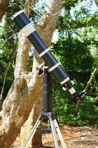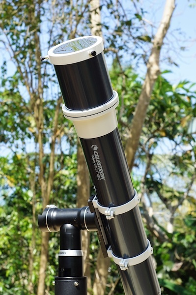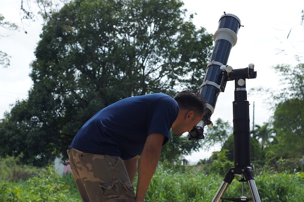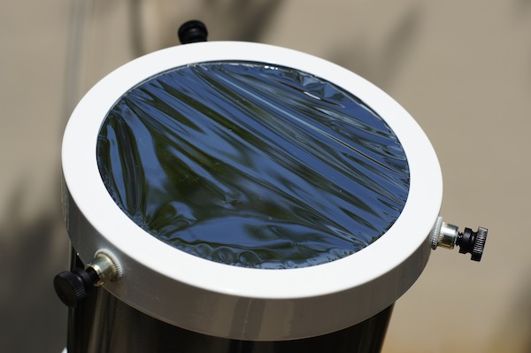 Es SUMAMENTE IMPORTANTE recordar que NO SE PUEDE utilizar un telescopio para observar el sol directamente. Es NECESARIO utilizar un filtro solar para bloquear la mayoría de la luz solar que entra al telescopio, y sólo dejar pasar lo necesario para observar la superficie de la estrella. En este caso, se utilizó un filtro de luz blanca, el cual se instala sobre el lente objetivo del telescopio de manera segura para que no se salga durante la sesión de observación.