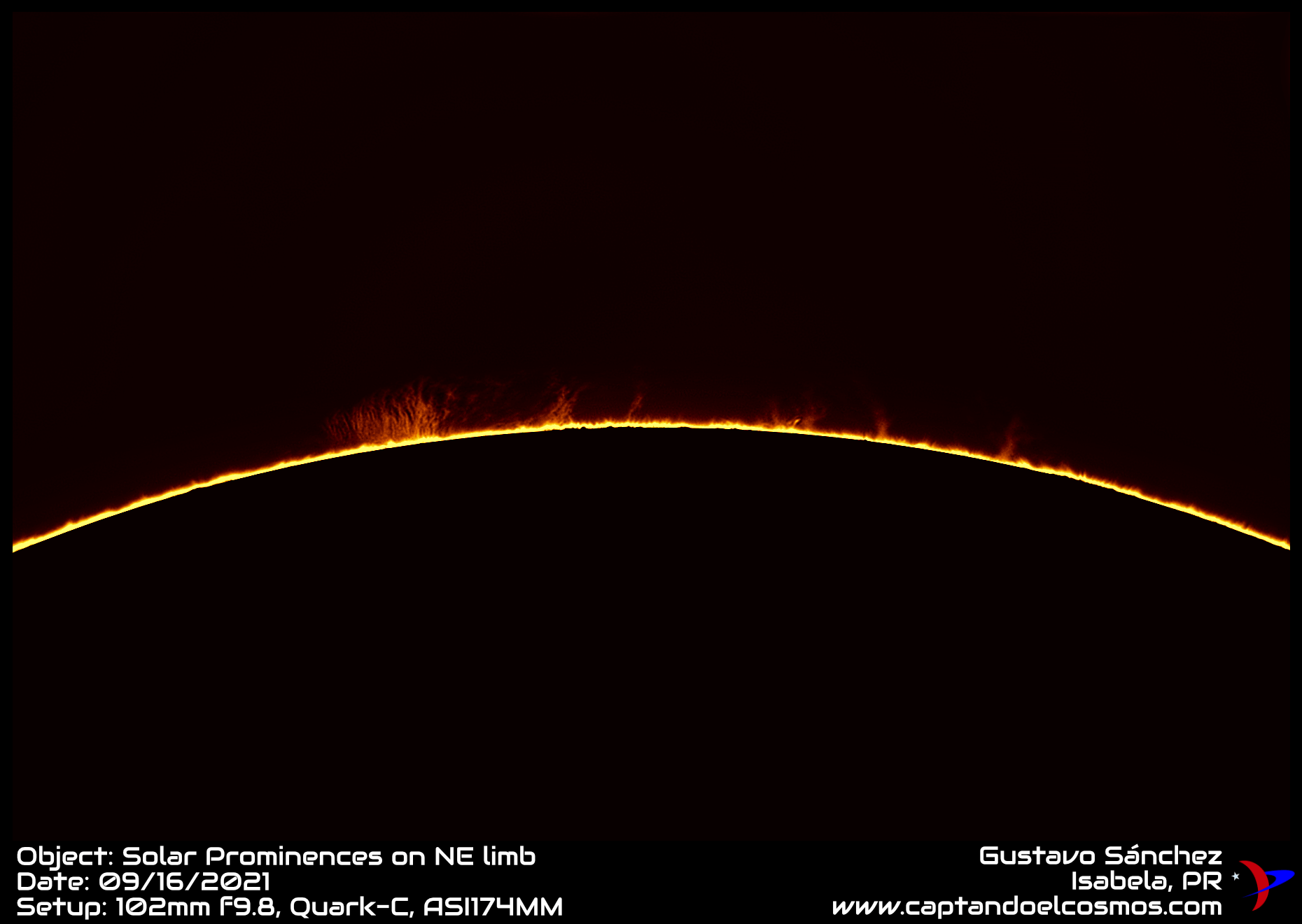 Aunque el sol durante la mañana de hoy no presentó mucha actividad en su superficie, en su borde se pudieron apreciar las prominencias que se ven a continuación. Estos fenómenos solares tienen un tamaño mucho mayor al de nuestro planeta, y se extienden a miles de kilómetros hacia el espacio.