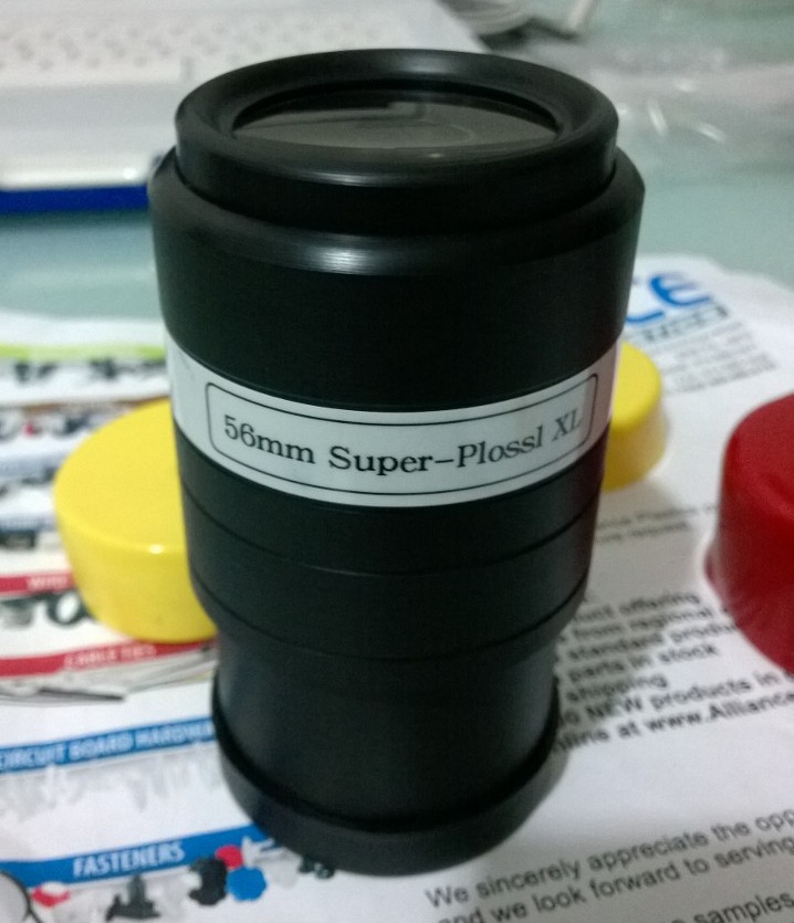 Mi ocular Russell Optics Super Plossl XL de 56mm es uno de mis mejores oculares, especialmente para lo que me costó. En combinación con mi refractor C6-R, provee una pupila de salida de 7mm, lo máximo que se teóricamente expande la pupila del ojo adaptado a oscuridad. A pesar de proveer una imagen de alta calidad, su relieve ocular deja mucho que desear (la distancia entre el ojo y el lente es excesivamente larga, lo que hace difícil observar a través de él). Estuve buscando algún adaptador para posicionar el ojo correctamente, pero no encontré ninguno que me sirviera.