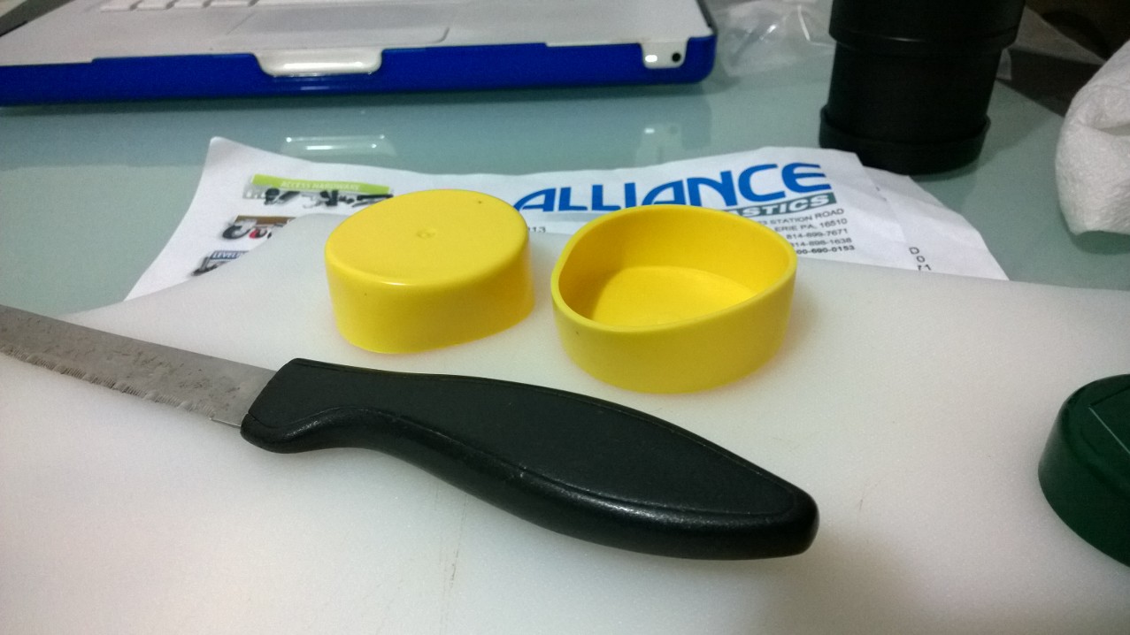 Después de buscar por internet por un tiempo, encontré esta compañía: Alliance Express. Esta compañía manufactura un sinnúmero de piezas plásticas de todos tipos incluyendo tapones de PVC blando para tuberías. Lo mejor de todo es que te proveen muestras gratuitas para que pruebes sus productos! Por lo tanto, mandé a pedir dos tapones de PVC del diámetro de mi ocular (convenientemente!) para hacer una copa que permita posicionar mi ojo a la distancia correcta:
