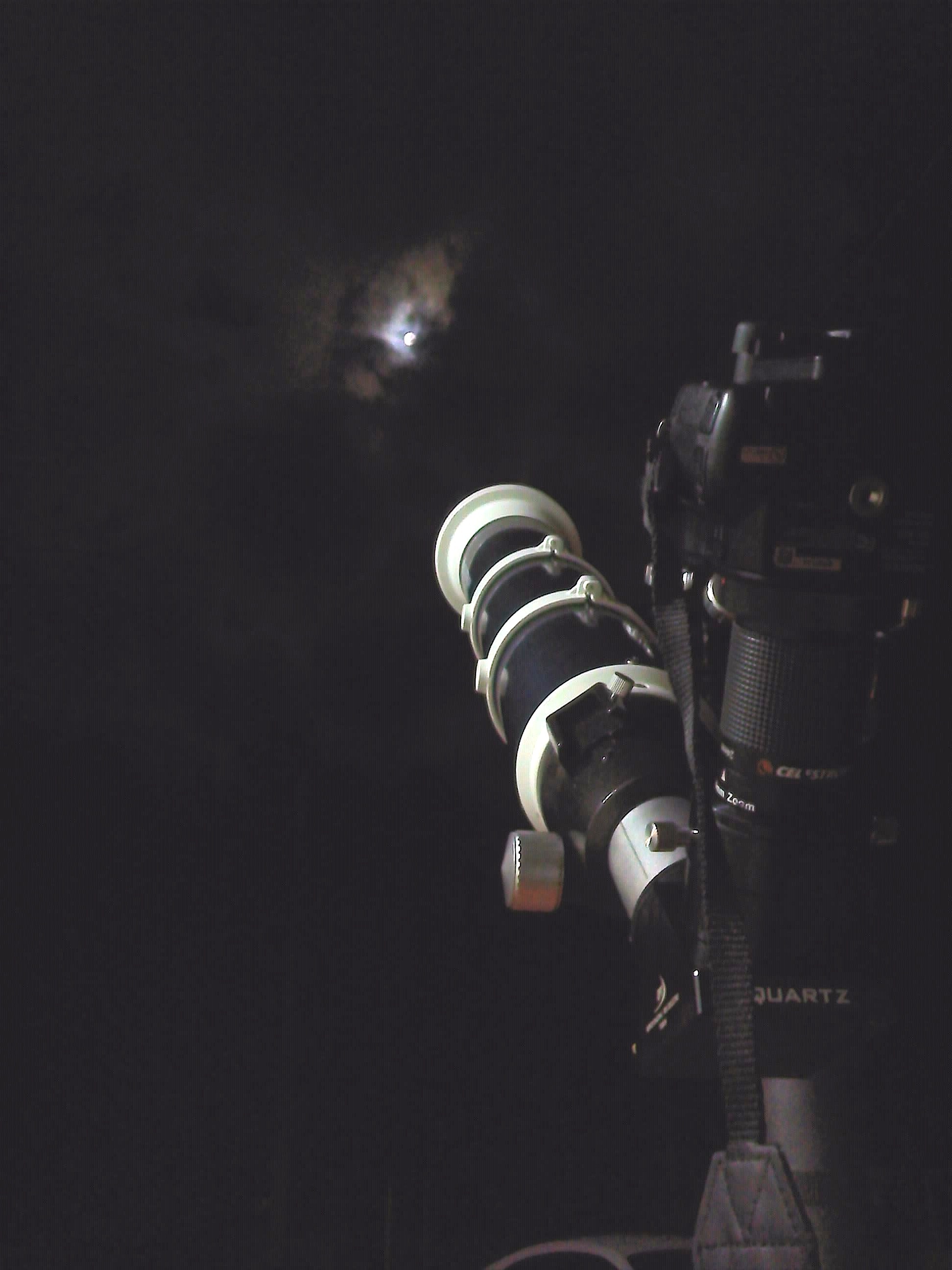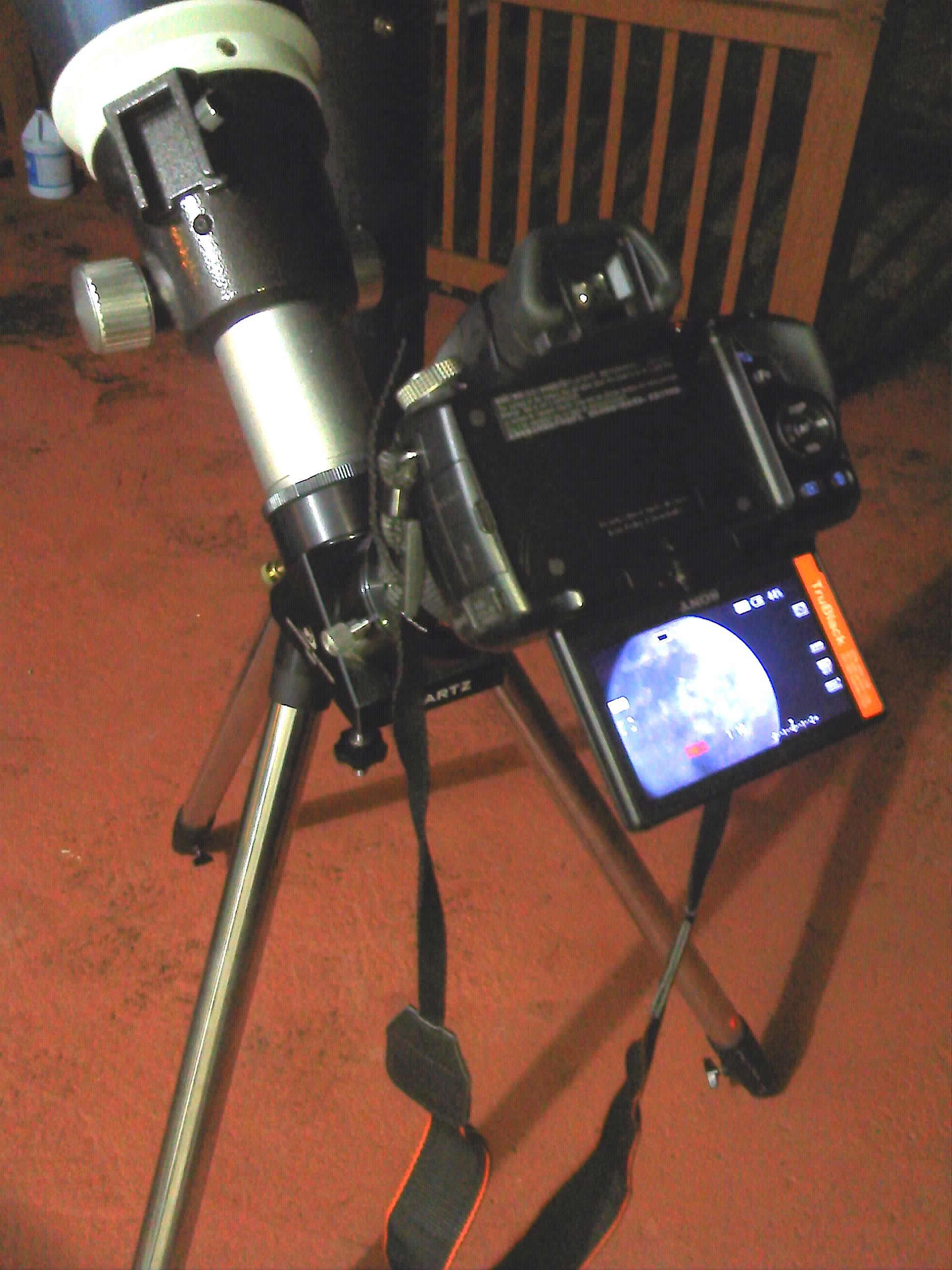 Para esta ocasión, decidí tomar unas secuencias de vídeo para apreciar los detalles de la superficie lunar. Utilicé mi cámara Sony A33 en conjunto con un refractor acromático de 120mm de apertura. Para magnificar la imagen, utilicé un ocular Celestron zoom 8-24mm adaptado a la cámara.