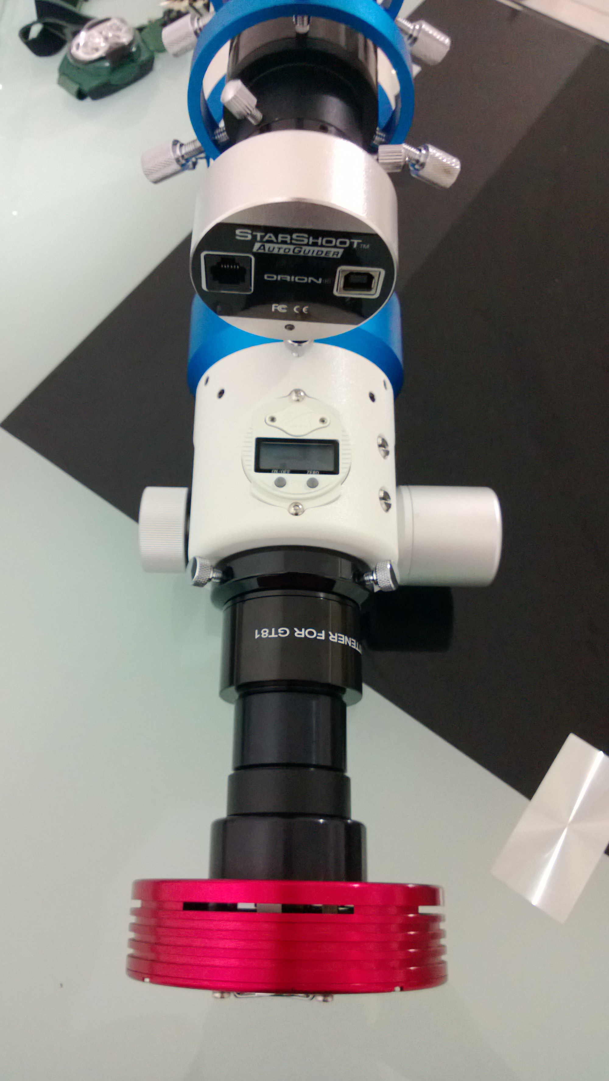 El WO GT81 va a ser mi telescopio principal para la astrofotografía del espacio profundo, por lo que le instalé mi cámara CCD Atik 314L+ en conjunto con el corrector incluido. El sistema de guiado Orion StarShoot Autoguider fue instalado permanentemente en los anillos superiores, de manera que se pueda ahorrar tiempo de instalación cuando se use en el campo. Además, mi objetivo es usar el autoguider como reemplazo para mi buscador óptico, ya que provee un campo visual de poco más de dos grados. La CCD en conjunto con el refractor provee un campo visual de poco más de un grado.