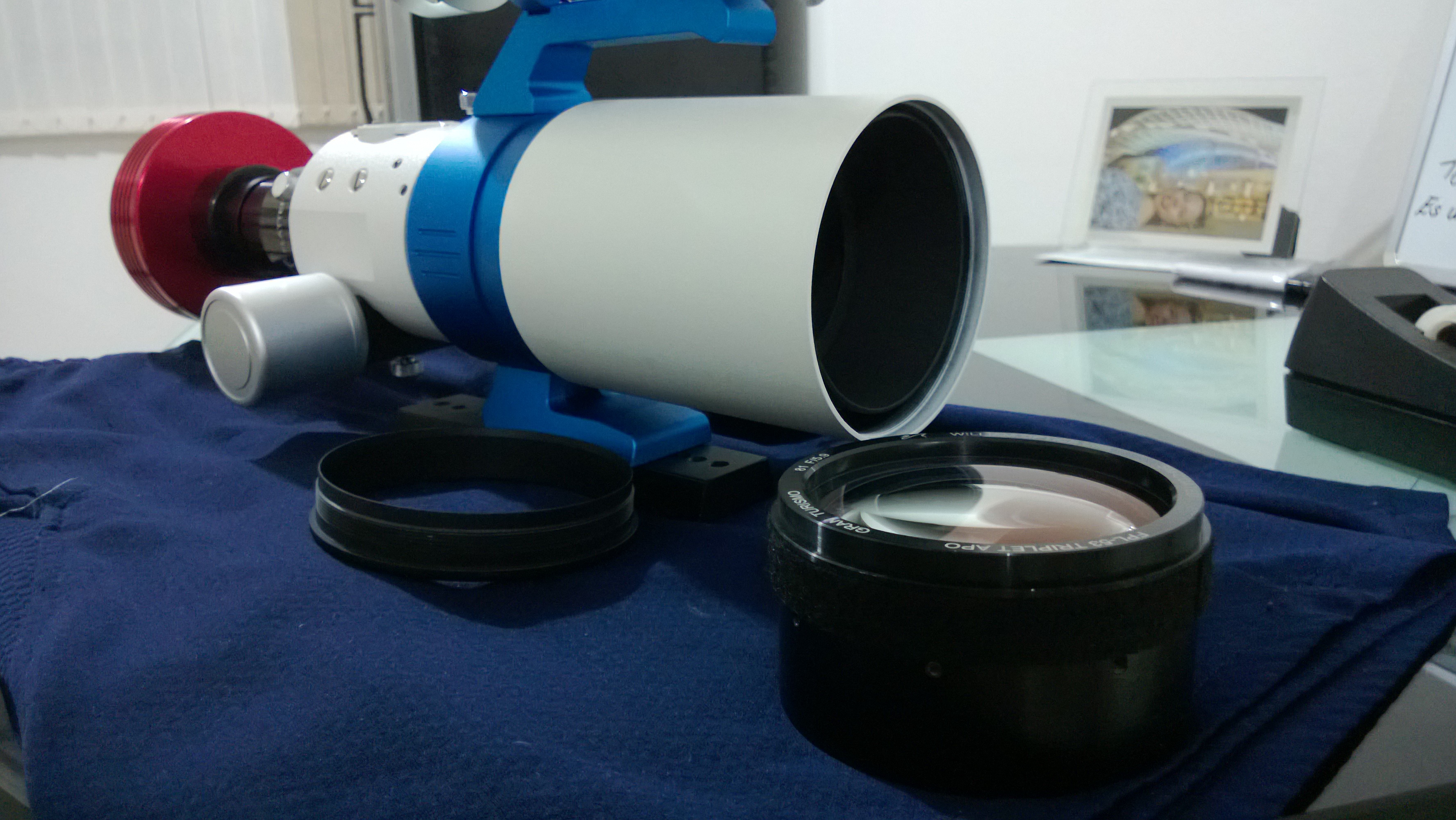 Después de sacar todos los componentes de la caja, instalé la barra de manejo en la parte superior del telescopio, la cual tiene anillos integrados para instalar un telescopio guía de hasta 50mm de apertura. Esto es perfecto para mi buscador guía Orion Finder Guider. Debajo del «pie» del telescopio, del mismo atractivo color azul metálico del resto del telescopio, monté una barra tipo «Vixen» para evitar así «dañar» el terminado azul del telescopio. Para mi sorpresa y decepción, no todos los componentes se veían tan inmaculados como el terminado del telescopio, ya que noté que los lentes del objetivo tenían polvo en tanto la superficie exterior como interior del telescopio. Esto inicialmente me incomodó bastante, lo cual me hizo considerar devolver el telescopio, pero luego, con un poco de más sangre fría, me comuniqué con el vendedor para tratar de resolver el problema. El vendedor fue muy atento y me envió una serie de instrucciones que me permitieron sacar el lente objetivo y limpiarle ambas superficies.